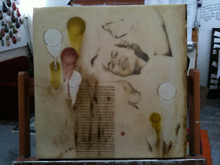 Today I finished the second piece in my new, and still untitled, series. I am finding that I need to work on multiple pieces at a time. One to two days are needed to paint the images of the women, and one day, at least, is needed for the wax and embellishments. Sometimes that last part takes longer, depending on how long it takes me to come up with the random components that I add on top of the wax. If I have three pieces going at the same time, I can paint the image of one while the wax heats up for the other piece and I am thinking about the embellishments of the third.